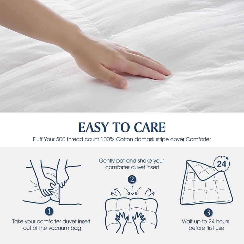 - 【Machine Washable】Machine washable (in cold water), no shrinkage or fade which saves you a lot of time and energy. Tumble dry on low heat.And another tips,since the down comforter is vacuum packed, it is recommended to spread it for 24 hours and pat or shake gently by holding each end to keep the filling evenly distributed. This increases airflow and helps stop the clumping.