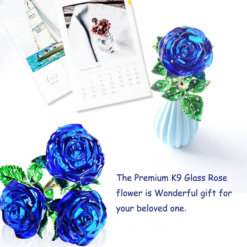 Blue Rose, K9 Crystal Rose Flower, Forever Glass Rose with Green Leaves, Unique Gift for Girlfriend Wife Mom on Valentine's Day, Mother's Day, Thanksgiving, Christmas, Birthday, Anniversary.