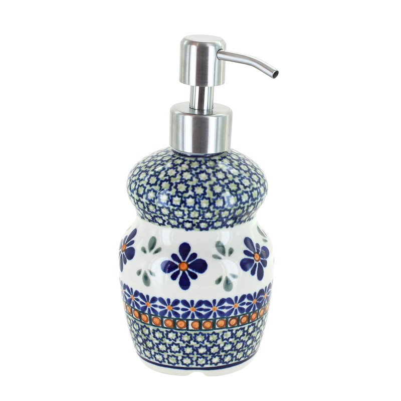 - Soap dispensers from Zaklady have a unique easy to hold shape and stainless steel soap pump. Get in your favorite pattern to keep by the bathroom or kitchen sink! 6.75 inches tall; 3.25 inches wide.