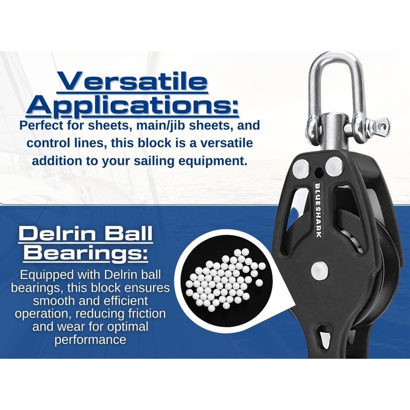 - Smooth Operation: Delrin ball bearings are integrated into the block to minimize friction and provide a smooth, efficient operation. This ensures that lines run smoothly through the block, reducing wear and tear on the lines and the block itself.