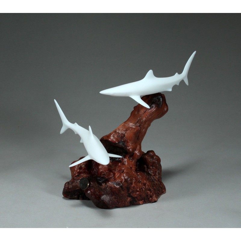 BLUE SHARK DUO Sculpture by JOHN PERRY 7 in high Pellucida on Polished Burlwood Base