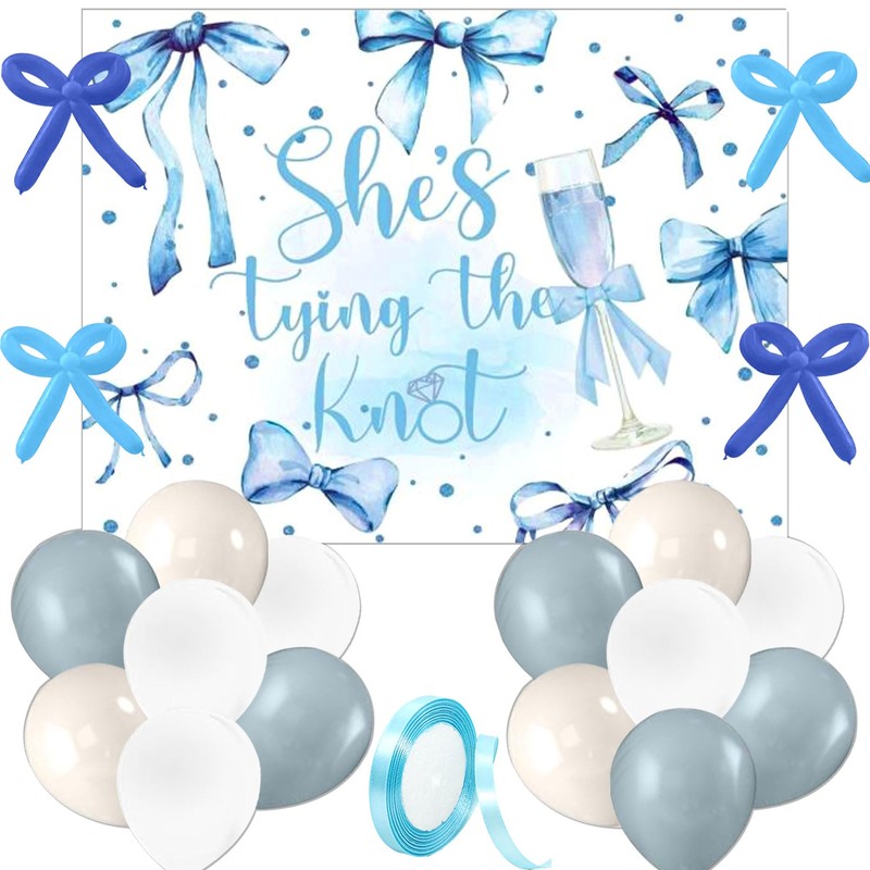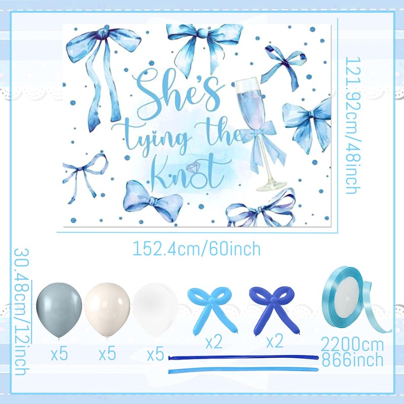 - Products Included: You will receive 1 “She’s Tying the Knot” backdrop (48x60-inch), 5 dark blue balloons, 5 white balloons, 5 ice-cream white balloons, 1 sky blue ribbon, 2 light blue long balloons and 2 deep blue long balloons can be used to make a bows.