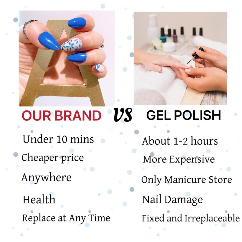 - Quick Application: Easy to apply press-on nails There is no need to go to the nail salon, Acrylic nails can be changed in a few minutes,and Glue on Nails it is easy to remove, so that you can easily create your exclusive nails.