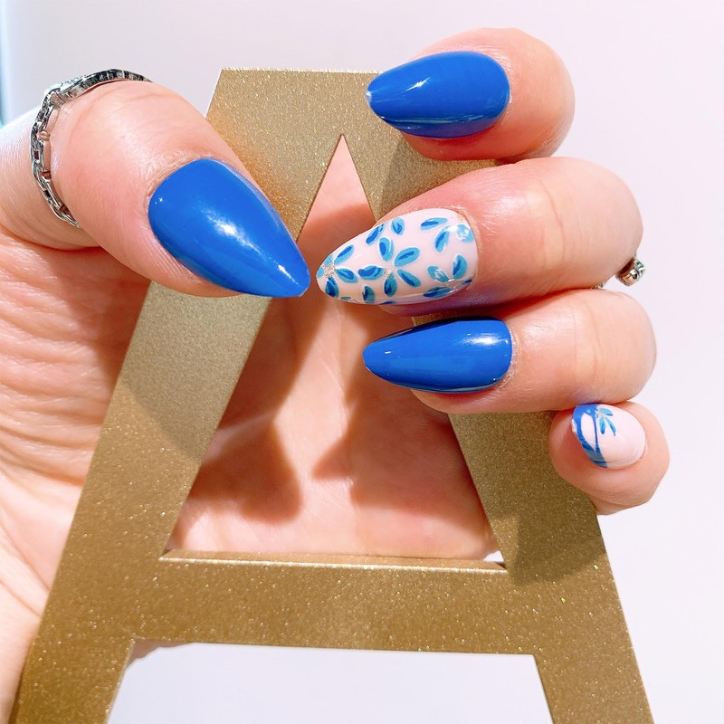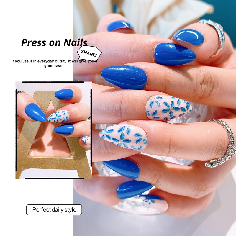 - These press - on nails showcase a captivating blend of vibrant solid blue and delicate floral patterns. Some nails feature a nude base adorned with charming blue flowers,while others display a clear base with intricate blue floral designs.