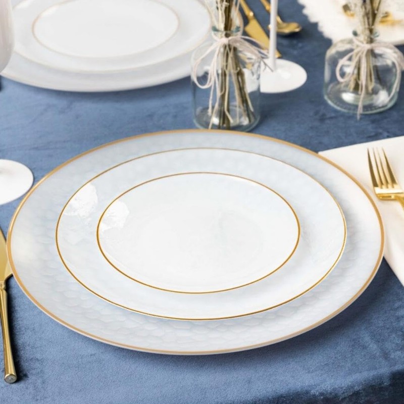 Blue Sky Organic Hammered White Transparent Gold Rim Plates - 10 Count, 10" | Round Disposable Plastic, Elegant Design for Parties & Events