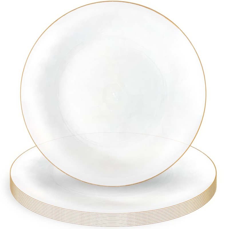 - BOLD AND ELEGANT DESIGN: Our Organic Hammered Clear With Gold Rim Plates feature a stunning gold/clear color combination, perfect for adding a luxurious touch to your parties and events. Upgrade your tableware game with these eye-catching and sophisticated disposable plates.