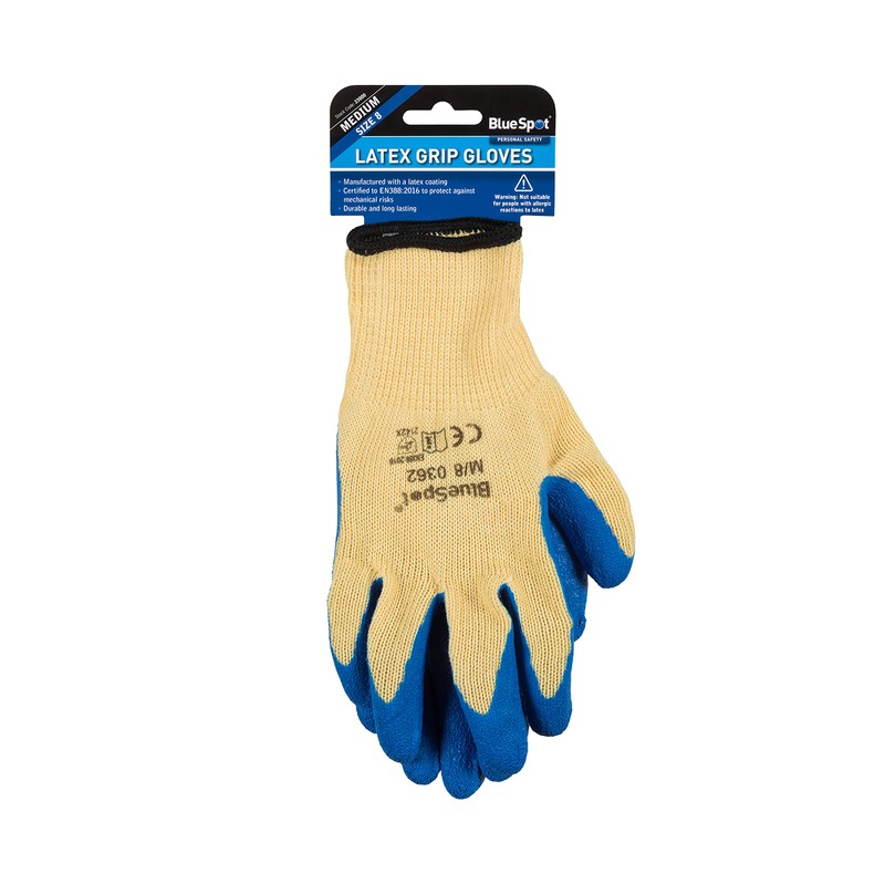 - The Blue Spot Tools latex grip gloves have been manufactured and tested in accordance with European standards to ensure high levels of performance.