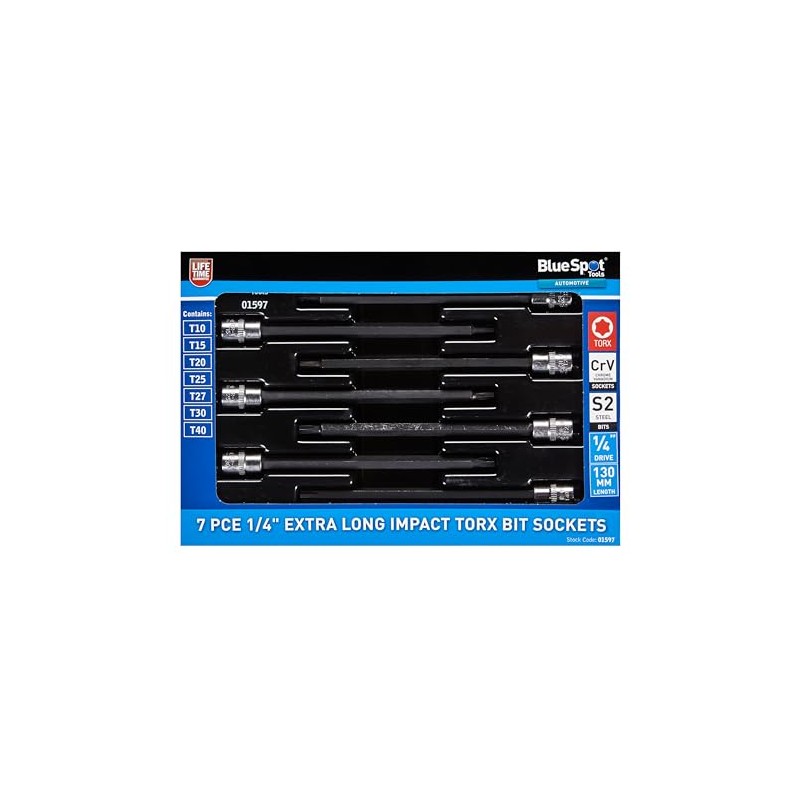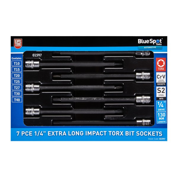 - The Blue Spot Tools 7 Piece 1/4-Inch Extra Long Impact Torx Bit Sockets are ideal for use with 1/4-inch tools. Sockets are manufactured from heat treated chrome vanadium for increased durability. The bits are made of heat treated S2 steel. Supplied in plastic tray for convenient storage.