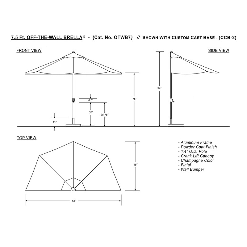 What a great new idea! OFF-THE-WALL BRELLA is a half-canopy patio umbrella that stands, without attachment, flush against a wall, window, sliding glass door or any vertical surface. This decorative and portable faux-awning provides cooling shade and welcomed protection from the elements. Now, homeowner's and condominium dwellers alike can open their drapes to enjoy the view and be sheltered from the hot sun or rain. The Yellow canopy is made of Olefin fabric for long lasting durability and color. The sturdy frame has a tough, powder coat, Champagne color finish and a hand crank for easy raising and lowering of the canopy. Fully opened, the umbrella stands 94" H x 88" W x 45" D. When closed, the upper pole and canopy can be separated from the lower pole for compact storage. Purchasing an OFF-THE-WALL BRELLA - CUSTOM CAST BASE (Item # CCB-2) is recommended. The stable 40 lb. Custom Cast Base is specially designed to withstand movement from the wind. No tools needed.