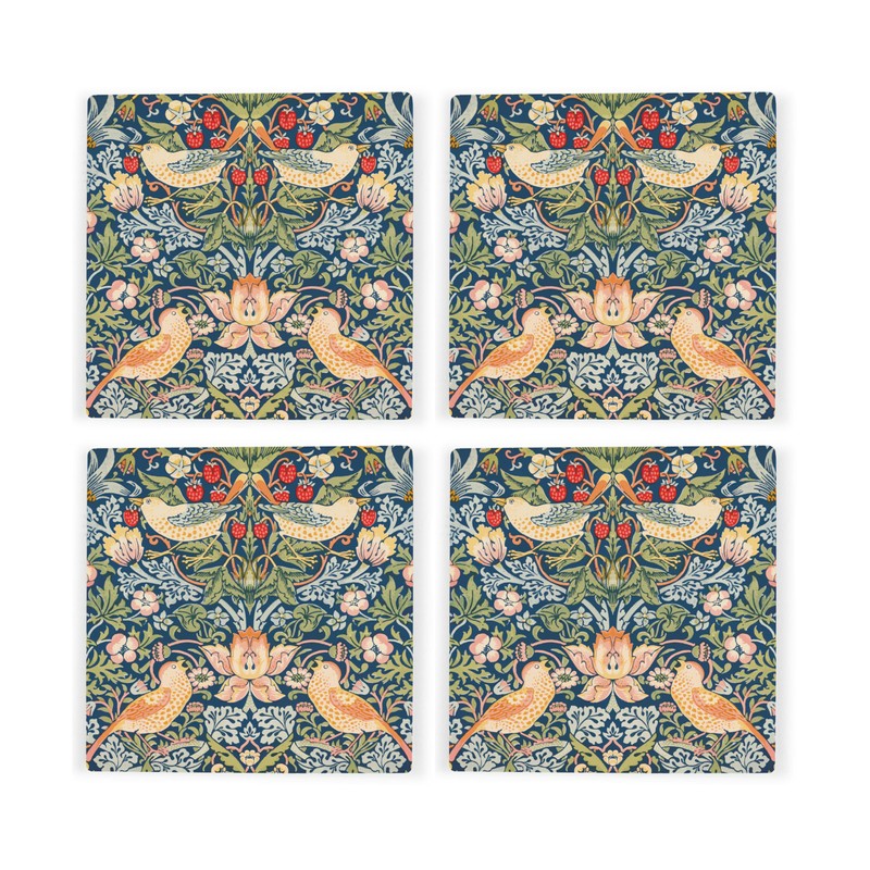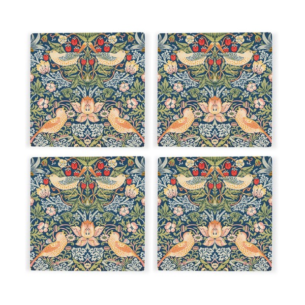 - This set of artistic ceramic coasters is an unusual yet timeless gift for art lovers! Stylised on the works of famous designer William Morris, featuring a bird print surrounded by foliage and fruits on a deep blue background. Perfect for protecting your surfaces from hot mugs!