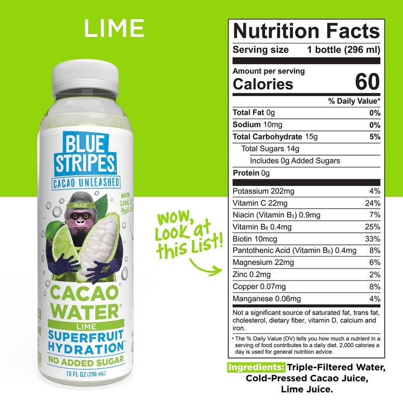Blue Stripes Cacao Water - Cold Pressed Superfruit Hydration with Electrolytes & Antioxidants, No Sugar Added, All Natural, Great for Protein Shakes & Smoothies - Lime, 6 Pack