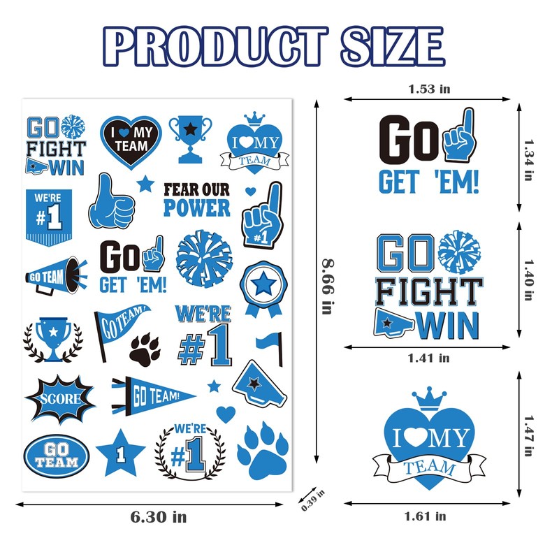 - Team Spirit Design: These Glitter team tattoo stickers add glitter material to make the tattoo stickers more eye-catching when worn, and with motivational slogans such as "GO TEAM", "WE'RE #1", "GET 'EM", combined with trophies, stars, flags, gestures and other elements that symbolize unity and victory, it can enhance the sense of belonging and pride of team members