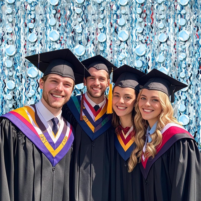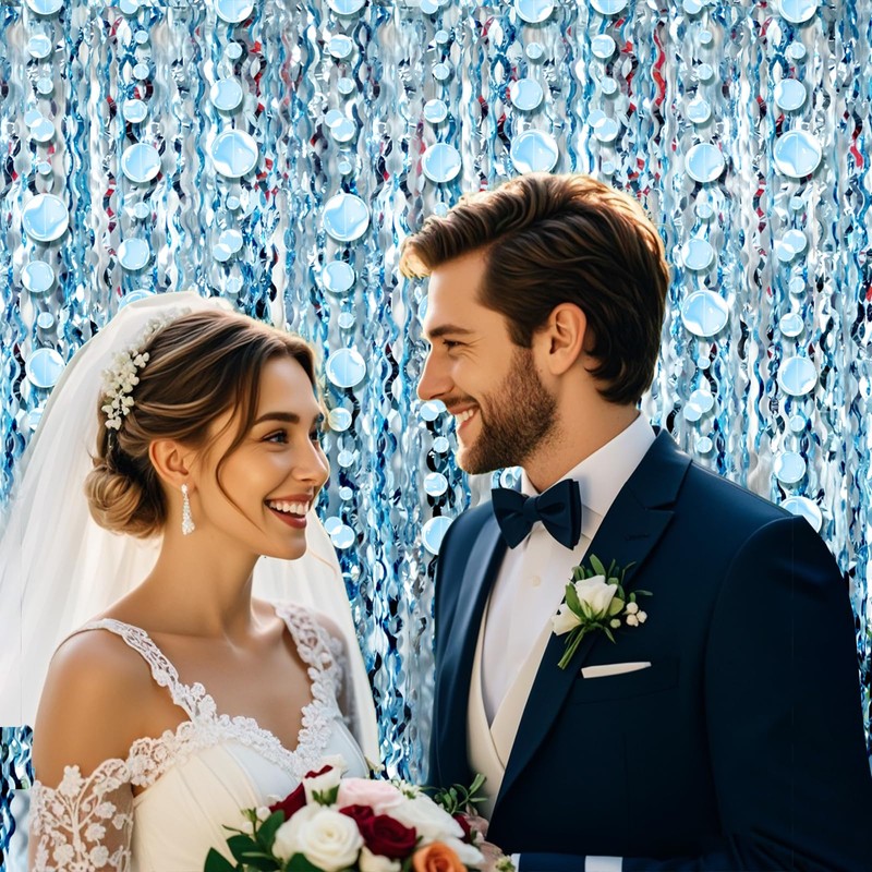 - Size: The size of the blue foil tassel curtain is 3.3 x 6.6 feet, and the length of each string of blue transparent bubble wreaths is 6.6 feet.