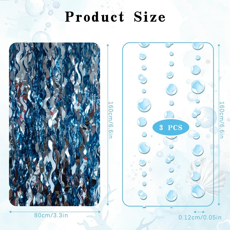 - Products include: 1 * 3.3 x 6.6 feet flashing ocean blue wave tinsel foil curtain, 3 * transparent bubble garlands.