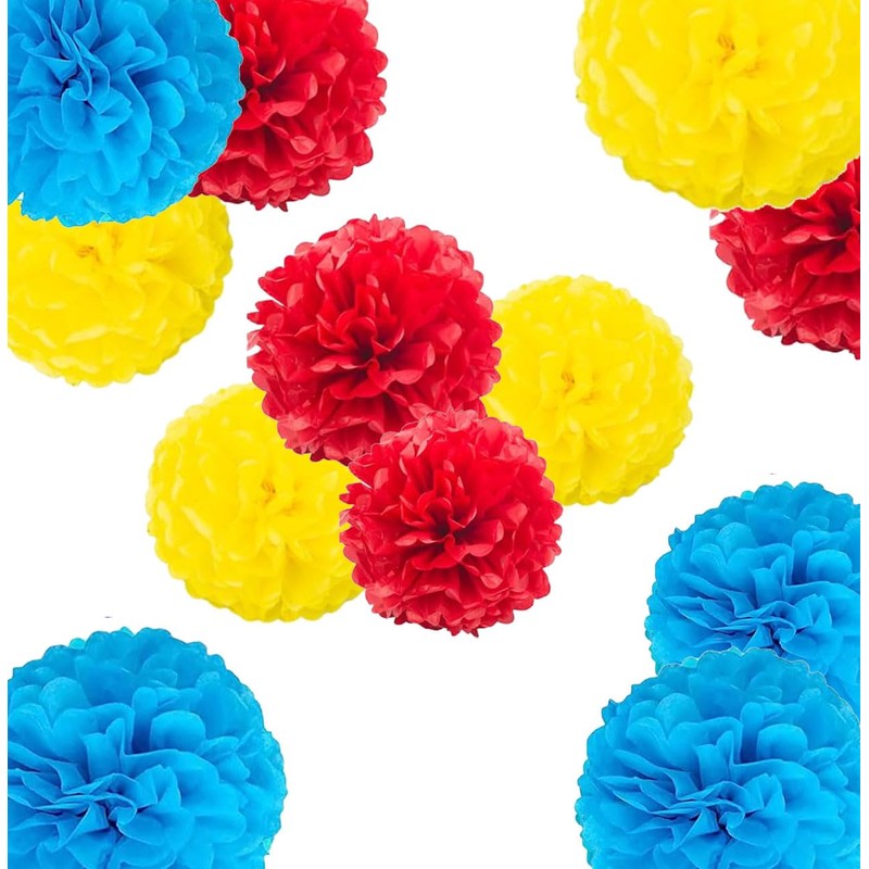 Blue Yellow Red Paper Pom Poms,Party Tissue Paper Flowers Balls,Party Hanging Decoration Supplies, Size of 10inch, 12inch, Pack of 12