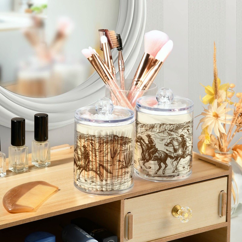 Blueangle 4PCS American West Cowboy Qtip Holder Dispenser with Lids - Apothecary Jar Containers for Vanity Organizer Storage - Plastic Food Storage Canisters