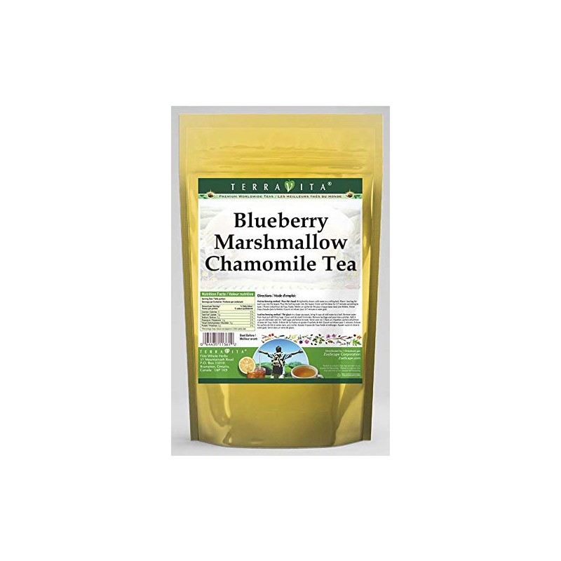 Our Blueberry Marshmallow Chamomile Tea is a delicious flavored Chamomile tea with Blueberries, Marshmallows (Mini) and Jasmine that you will enjoy relaxing with anytime! The natural Blueberry Marshmallow taste is delicious! - Ingredients: Chamomile tea, Blueberries, Marshmallows (Mini), Jasmine and Natural Blueberry Marshmallow Flavor. - Hot tea brewing method: Bring freshly drawn cold water to a rolling boil. Place 1 teabag for each desired cup into the teapot. Pour the boiling water into the pot, cover and let steep for 2-4 minutes. Pour into your cup; add milk and natural sweeteners to taste. - Iced tea brewing method: (to make 1 liter/quart): Place 5 teabags into a teapot or heat resistant pitcher. Pour 1 1/4 cups of freshly boiled water over the teabags. Steep for 5 minutes. Quarter fill a serving pitcher with cold water. Pour the tea into the serving pitcher. Add ice and top-up with cold water. Garnish and sweeten to taste. - TerraVita is an exclusive line of premium- quality, natural source products that use only the finest, purest and most potent ingredients found around the world. TerraVita is hallmarked by the highest possible standards of purity, potency, stability and freshness. All of our products are prepared with the highest elements of quality control, from raw materials through the entire manufacturing process, up to and including the moment that the bottles or bags are sealed for freshness and shipped out to you. Our highest possible standards are certified by independent laboratories and backed by our personal guarantee. - TerraVita exists to meet and ensure your family's health and wellness without the harmful effects or chemicals and prescription medications. We strive to make all of our products affordable and reliable and are constantly searchi