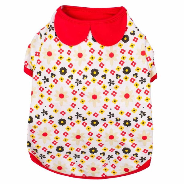Unleash your precious pooch from all worries and let her relax in this beautifully-designer Peter Pan collar T-Shirt! With the red trims on the neckline, hem and short sleeve cuffs, this soft cotton T-Shirt will be one of her favorite wardrobe essentials. Those little garden flowers are nicely scattered on the T-Shirt, which creates eye catching patterns. This little T-Shirt will keep your pooch exactly where she belongs - in the spotlight no matter she is at home, on the beach or playing at the park. Our Tshirt design is great for small to medium dogs.