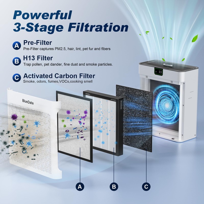 - 【𝐄𝐚𝐬𝐢𝐞𝐫 𝐅𝐢𝐥𝐭𝐞𝐫 𝐑𝐞𝐩𝐥𝐚𝐜𝐞𝐦𝐞𝐧𝐭】: The purifier comes with a filter replacement reminder function, and it's recommended to replace the BlueDate air filter accessory every 4-6 months, depending on the air quality in your area. You can search for the BlueDate on Amazon to find the replacement filters you need.