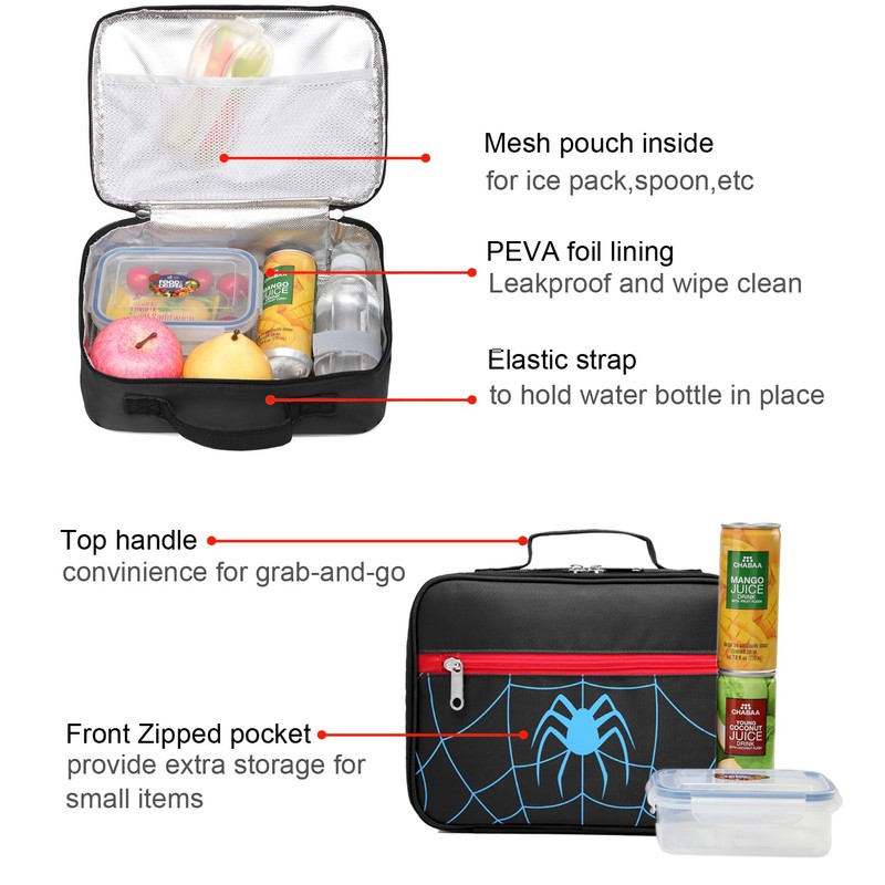 • Easy to use:top grab-handle,interior mesh pouch for ice pack and front zipped pocket for small items like spoon,napkin.