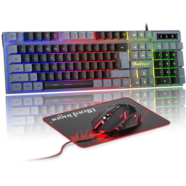 BlueFinger RGB Gaming Keyboard and Backlit Mouse Combo, USB Wired, LED Gaming Set for Laptop PC Computer Game and Work(Gray & Black)