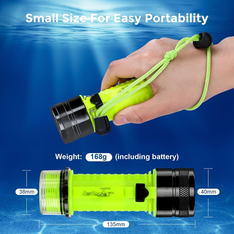 - ✅ Sturdy And Durable: Designed with an aluminum alloy lamp head and fluorescent ABS lamp body, it has an IPX8 waterproof rating, which is very suitable for beginner divers and can withstand the test of the underwater environment. Waterproof, corrosion-resistant and shockproof, with a service life of 60,000 hours or more.