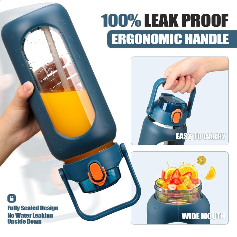 - MOTIVATIONAL TIME & VOLUME Marker: With inspirational TIME and VOLUME marker, the 64 oz glass water bottle can remind you of your goals of drinking all days.2 liters large capacity allow you not to refill it frequently any more. That is equivalent to 8 cups of water,suggested by scientists for human drink per day, helps you stay hydrated and daily healthy.