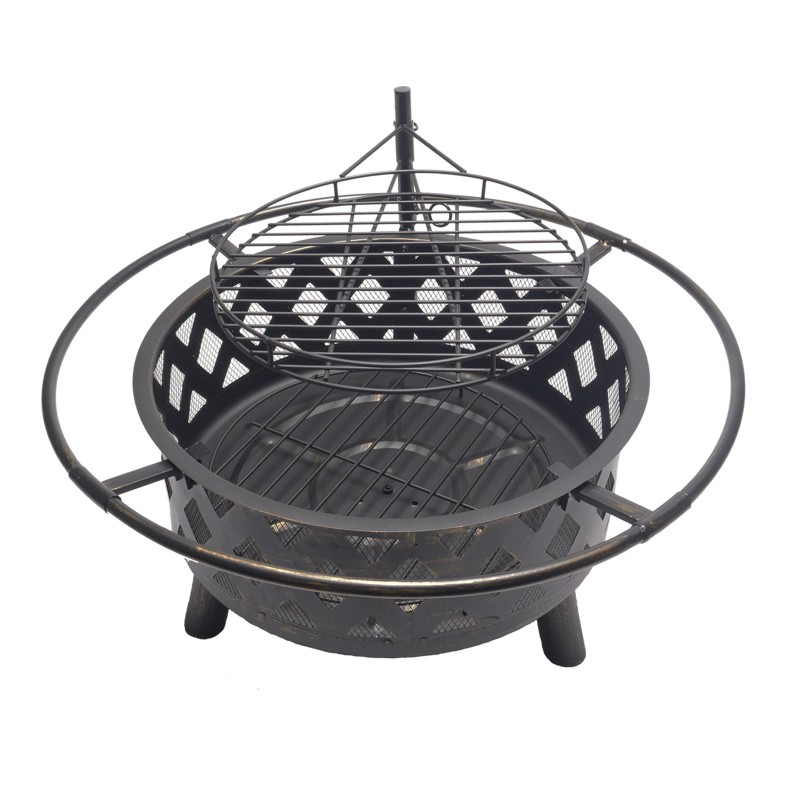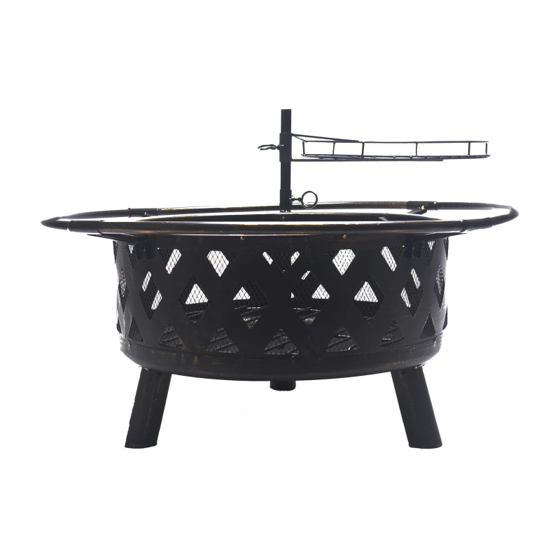 The 30 in. Roadhouse Steel Wood Burning Fire Pit from Bluegrass Living is ideal for a robust backyard fire or barbecue. Beautiful handcrafted decorative moldings embedded in a rich, oil-rubbed bronze finish is sure to make an impression and add an elegant décor to any outdoor space. While entertaining or enjoying your fire pit, use the included 360-degree cooking grid with adjustable height swivel to barbecue up something special.