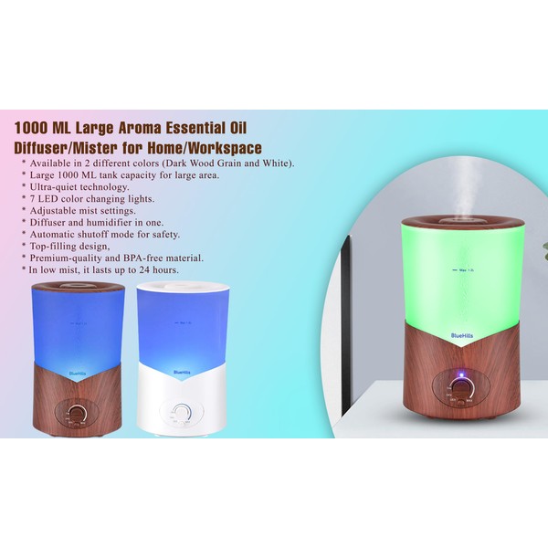 BlueHills Large 1000 ML XL Essential Oil Diffuser Dark Wood Grain Aroma Humidifier 1 Liter Capacity for Big Room Home Long Run Kids Huge Coverage Area Quiet 1L A3