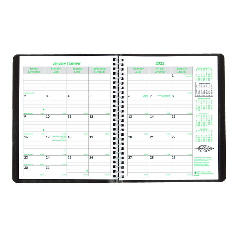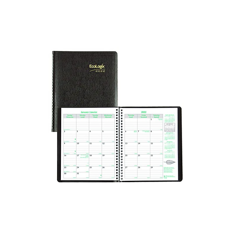 BLUELINE 2022 EcoLogix Monthly Planner, 14 Months, December 2021 to January 2023, Twin-Wire Binding, 8.875" x 7.125", Black, Bilingual (C430W.81B-22)