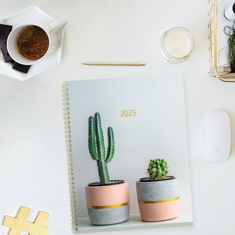 - Flexible gold twin-wire binding with thick poly cover construction and gold date detail allows planner to fold back for a flat and sturdy writing surface. Colourful Succulent Plants cover design, size: 11" x 8.5".
