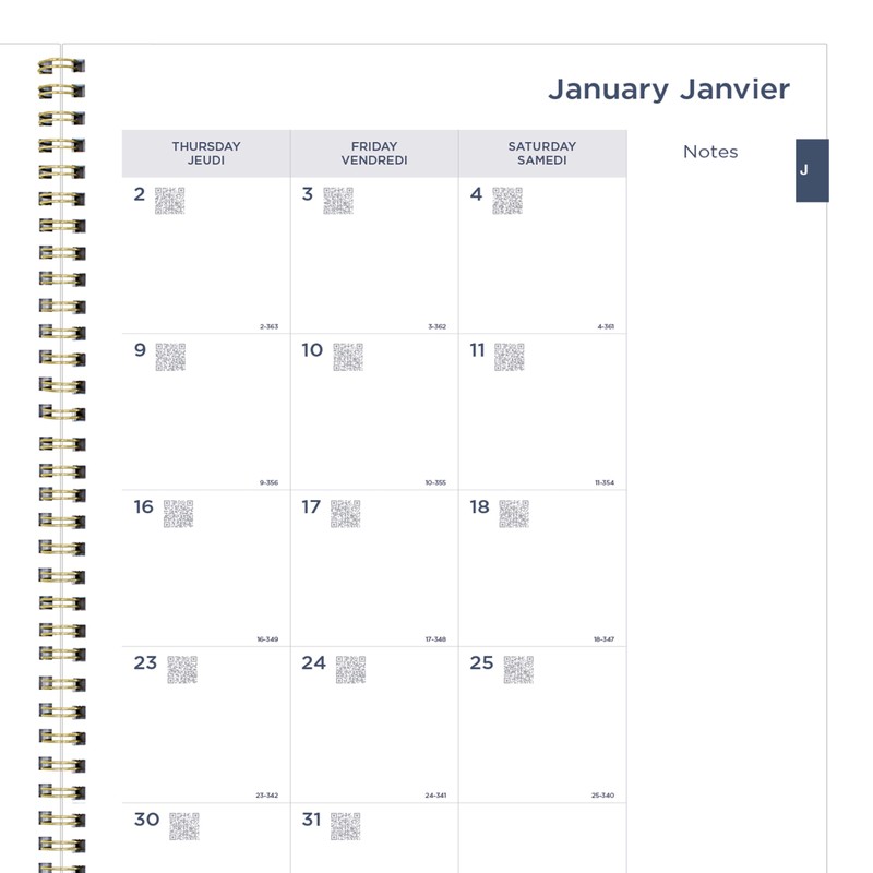 - Essential Monthly Planner spanning 14 months, December 2024 to January 2026. Month-on-two-pages format and one block per day layout (Sunday-Saturday). Dedicated area for notes on each spread. Bilingual: English and French.