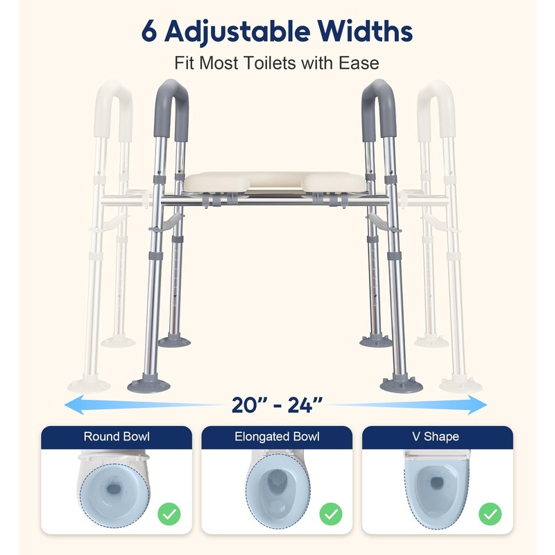 - Strong & Secure Support: Built with 1.4mm thick aluminum alloy and reinforced V-shaped side bars, this raised toilet seat supports up to 400lbs. Suction cup feet grip firmly to the floor, ensuring stability and confidence whenever you sit or stand