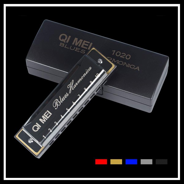 Blues Harmonica 10/24 Hole Stainless Steel C-Tone Airtight Beginner Advanced Set Case (Metallic Black, 10 Holes)