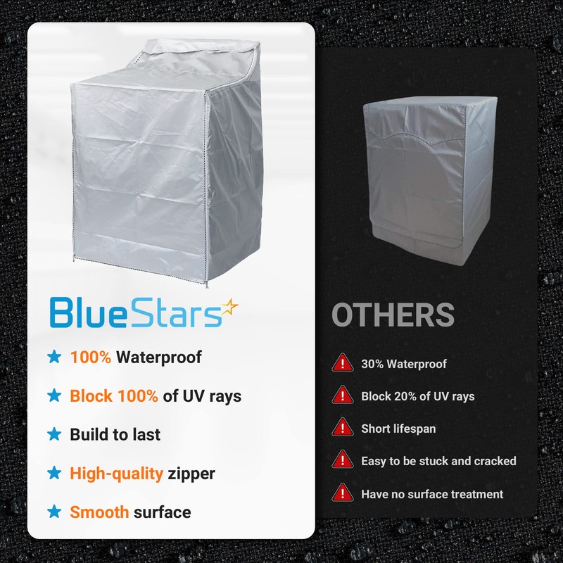 - ✅ SMART DESIGN FOR EASY INSTALL - BlueStars washer cover features zippers and velcros for easy access, with adjustable back ropes for a snug fit. This three-sided cover provides optimal protection while ensuring the machine remains cool, all designed for a quick and straightforward installation.