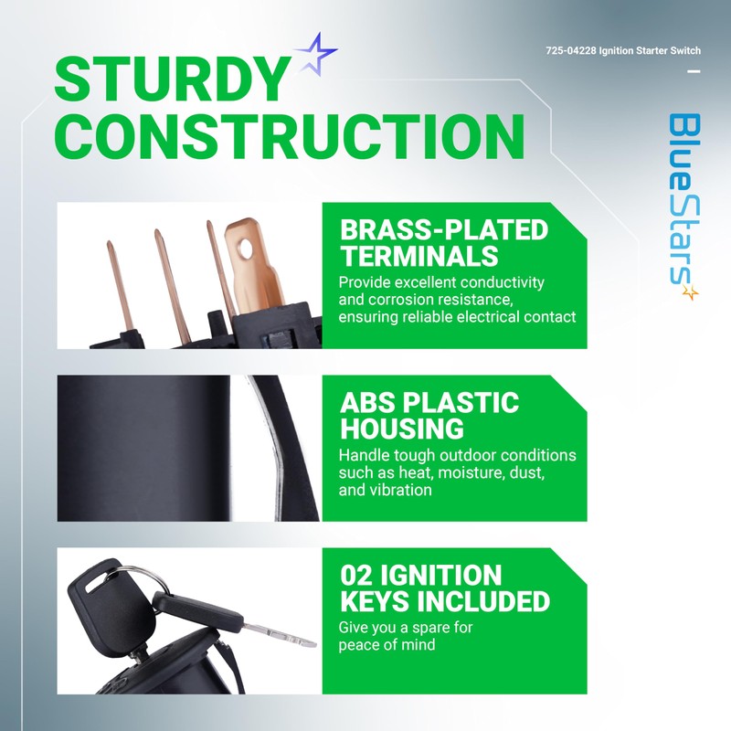 - RELIABLE IGNITION FOR ENGINE START-UP: The 725-04228 Ignition Starter Switch is designed to control the starting and stopping of your Lawn Mower’s engine with precision and safety. It features 5 terminal connectors and a 3-position rotary design. The positions from left to right (turning key clockwise) refer to stop, run/on, and crank. Each package includes 02 IGNITION KEYS, giving you a spare for peace of mind. (Note: This ignition switch doesn't control the headlight!)