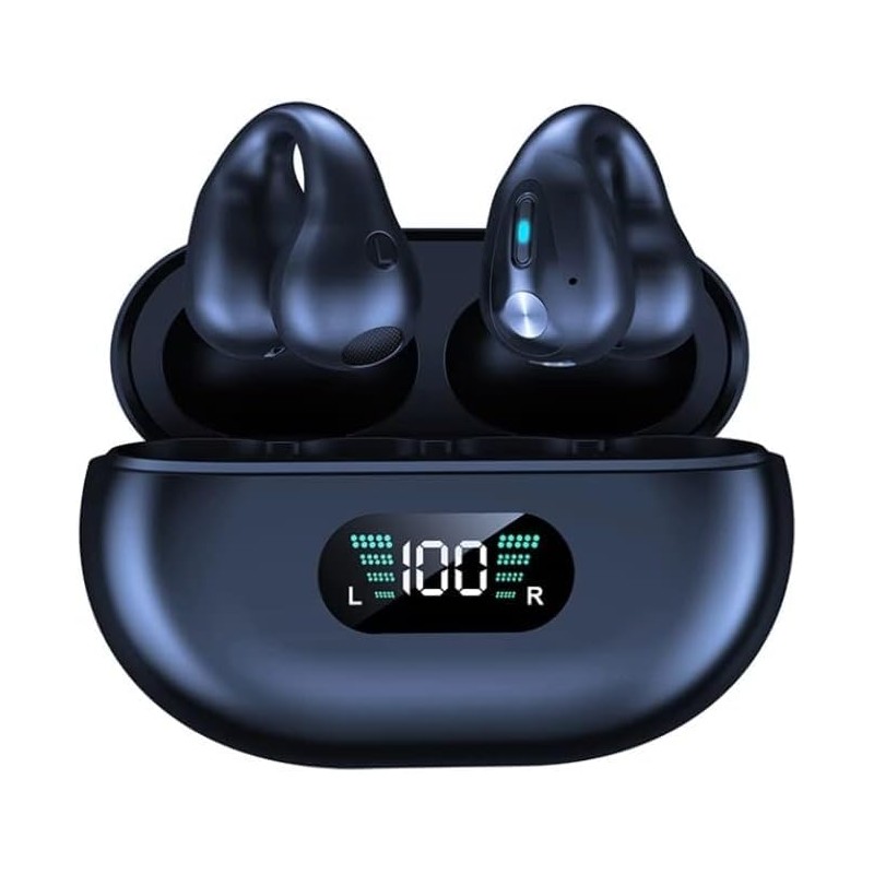 Bluetooth 5.3 Headphones Open Ear Clip-on HD Stereo IPX5 Waterproof Noise Cancelling Touch Control Microphone LED Power Indicator with Charging Box for Sports Cycling Driving (Black 2)