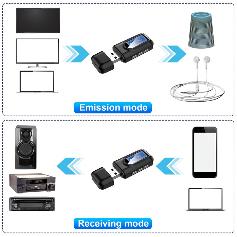 - 2 in 1 Bluetooth transmitter and receiver: Bluetooth adapter audio 5.0 offers remarkable versatility as it can act as a Bluetooth transmitter as well as a receiver. As a transmitter, you can wirelessly transfer music from your TV, PC or other non-Bluetooth devices to Bluetooth-enabled headsets, speakers or car stereos. As a receiver, it allows you to stream audio from your Bluetooth-enabled smartphone or tablet to non-Bluetooth enabled audio devices such as wired headphones or speakers.