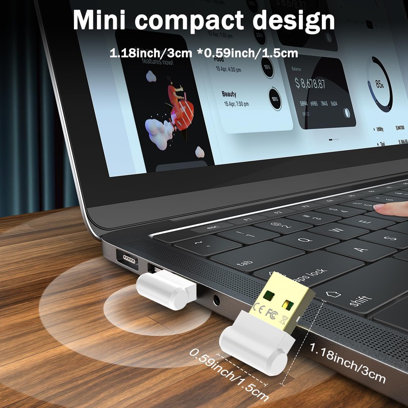 - 【Ultra-Small Size】: The stylish and compact design makes the upgraded Bluetooth receiver perfect for placing on a laptop or PC without even noticing it. You can easily carry it on your laptop without blocking the USB ports next to it.