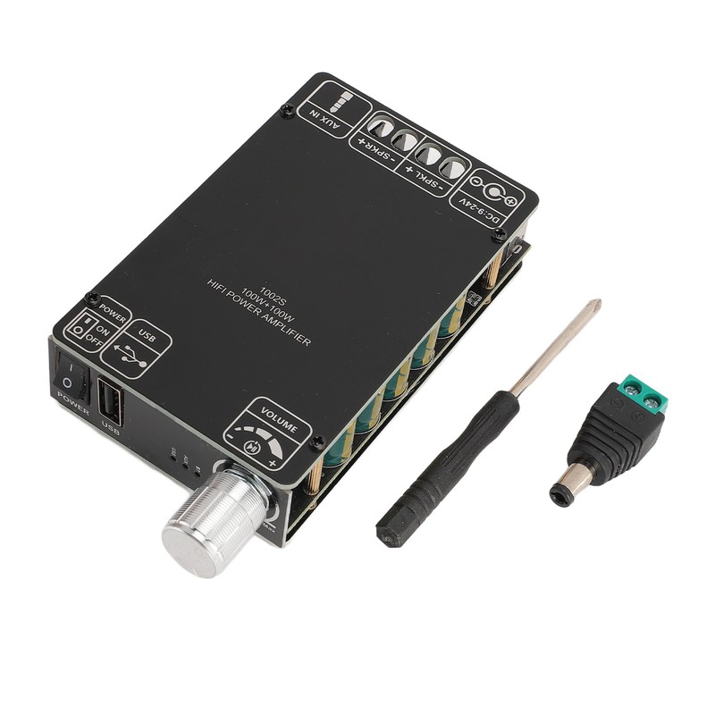 1、TPA3116D2 CHIPS: This amplifier board features dual HiFi grade TPA3116D2 chips, providing a wide voltage input range of DC 9‑24V, with a peak output of 100W plus 100W at 1kHz, 21V, and 4 ohm speakers. 2、MULTIPLE INPUT METHODS: Amplifier board supports Bluetooth input, 3.5mm AUX input, USB input and so on. Compatible with smartphones, tablets, laptops, MP3 players and many other devices. You can easily switch between preferred sound input methods. 3、INDICATOR LIGHTS AND UPGRADED DC SOCKET: This amp board includes different indicator lights for a more intuitive view of the current input mode. The upgraded DC socket ensures a no spark power connection for enhanced safety and reliability. 4、SUPPORTS MULTI MUSIC FORMATS: When playing music from a USB flash drive, MP3, FALC, MAV, APE and other music formats are supported. For formats such as FLAC, the music bit rate should be within 1500kbps, and for MAV, the sampling rate should be within 44100Hz. The USB flash drive must be formatted in FAT32 format and have a capacity of no more than 32GB. 5、APP CONTROL: This Bluetooth power amplifier board supports APP control, which allows you to switch input modes, set the amplifier board's Bluetooth name and password, etc. Experience the convenience of operating.