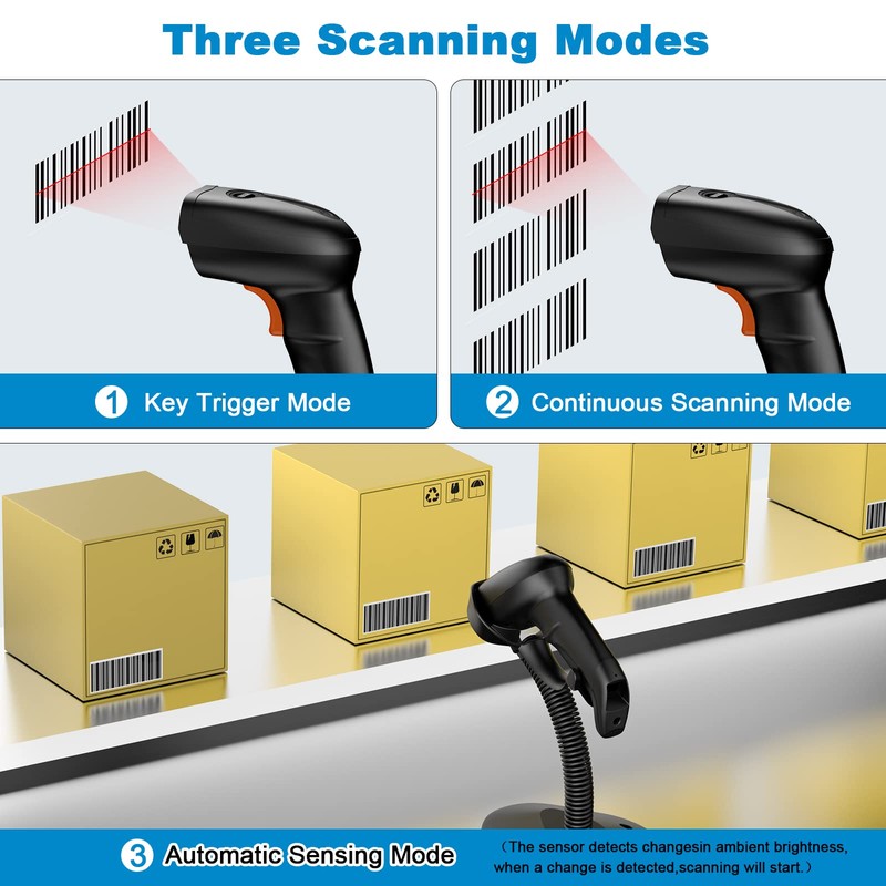 - Handheld barcode reader scanner especially equipped 360° adjustable stand, absolutely achieve hands-free function through auto-sensing mode, released your hand, which makes the scanning work much more effective and comfortable.