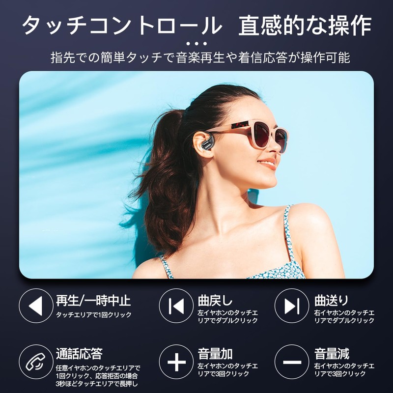 - 5)**Smart control comfort with one touch** "Intuitive touch control makes it easy to play and pause, skip tracks, adjust volume, and even activate voice assistant. It can be easily operated with one hand, so it is convenient when you are sweaty at the gym or when you can't take your smartphone out on a crowded train. IPX7 waterproof, so it is resistant to sweat and rain, so you can rest assured that it is suitable for outdoor activities and sports. In addition, the type that does not block your ears, you can also check the surroundings even if you want to immerse yourself in your world