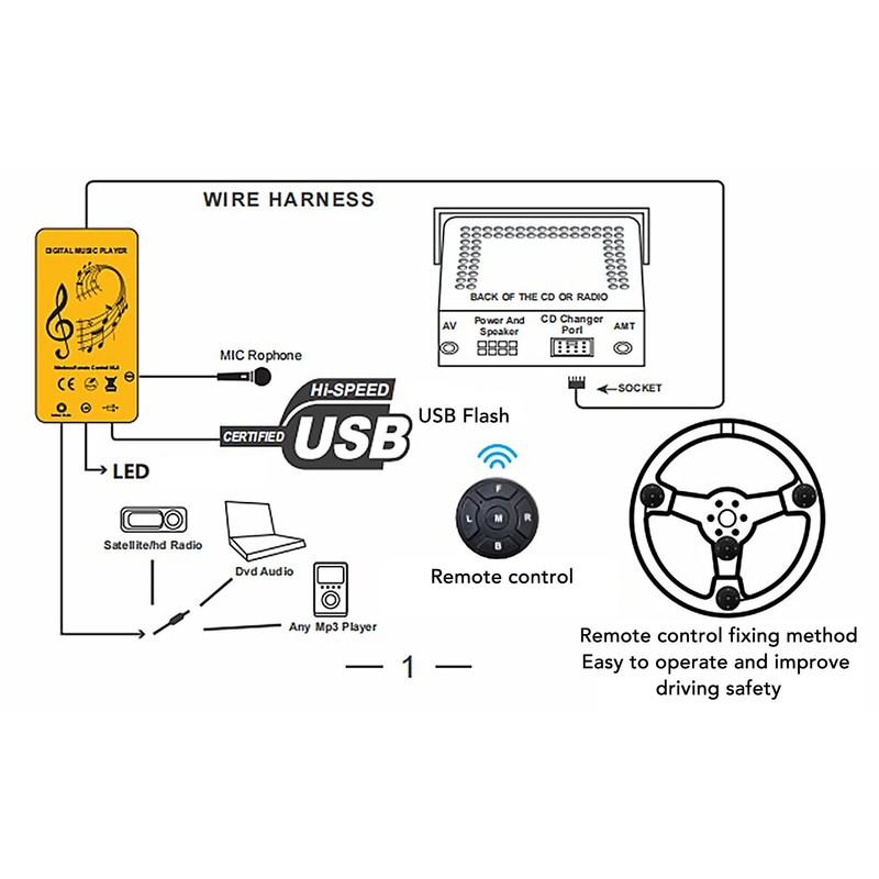 1、Fitment: Support car radio equipped with an audio input. Perfect fit for Clarion, for Blaupunkt, for Pioneer, for Alpine, for JVC, etc. 2、Equipped with Remote Control: Wireless remote control, the operation is simple and easy to understand, supports BT audio, USB Flash, 3.5 audio jack input. 3、With usb jack: This audio transmitter with usb port, support USB2.0 devices, such as U disk, SD card, SDHC, MMC, etc. and support MP3 and WMA music formats. 4、Bluetooth Use: You can use mobile phone searches for the Bluetooth device "KROWN 998" and connects it to complete CD playback through Bluetooth. 5、Support DIY Operation: As long as you can find the audio input interface of the CD, connect the left and right channels, and power on to complete the work.