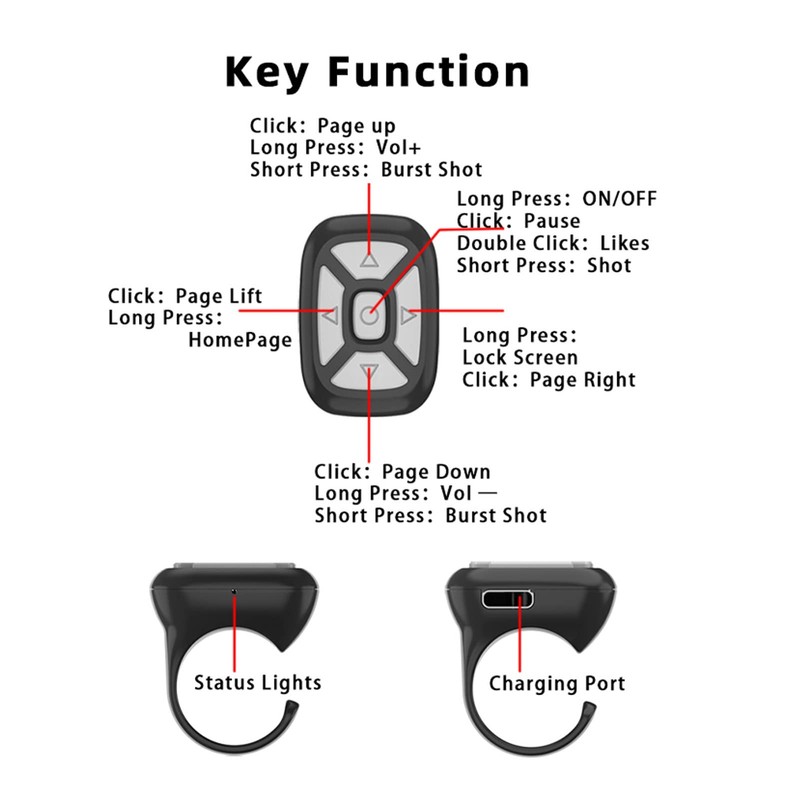 Product Functions: Page Turning up and down, Volume Increase and Decrease, Like, Pause, Take Pictures, Take Pictures Continuously, Record Videos