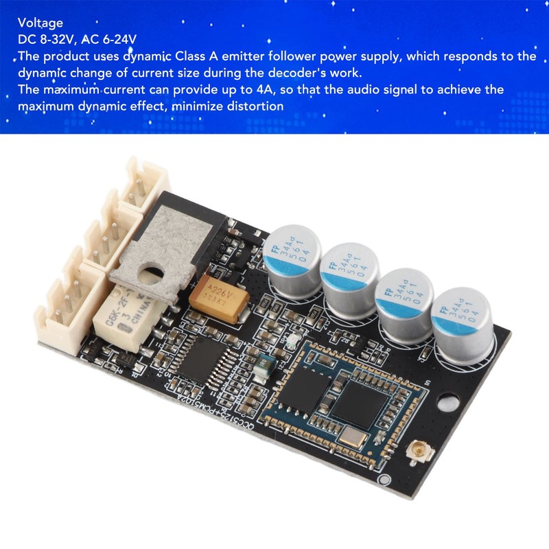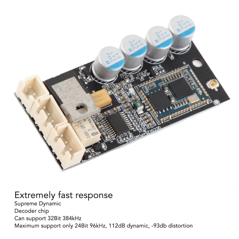 1、CLASS A: Bluetooth sound decoder board is powered by dynamic Class A emitter follower, which responds to dynamic changes in current level during decoder operation. 2、DISTORTION REDUCTION: Bluetooth decoder module can provide up to 4A current to maximize the dynamic effect of sound signal and minimize distortion. 3、DECODER CHIP: Bluetooth decoder chip can support 32Bit 384kHz, by optimizing the surrounding circuit material to get good sound. 4、CONNECTION: Default Bluetooth priority, wired input automatically disconnected when there is a Bluetooth connection, wired input automatically access when there is no Bluetooth connection, Bluetooth and wired automatically switch. 5、POWER INFORMATION: Power supply does not need to distinguish between positive and negative, DC power is 8‑32V 1A, AC power is AC 6‑24V 1A.