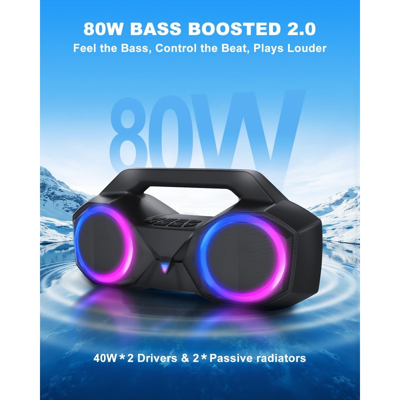 Bluetooth Speaker 80W(Peak)Loud with Bass, 20H Playtime, IPX7 Waterproof, RGB Lights, TWS, Large Portable Wireless Speakers for Outdoor, Home, Party, Pool, Beach, Tailgating, Gym, Work, Gifts (Black)