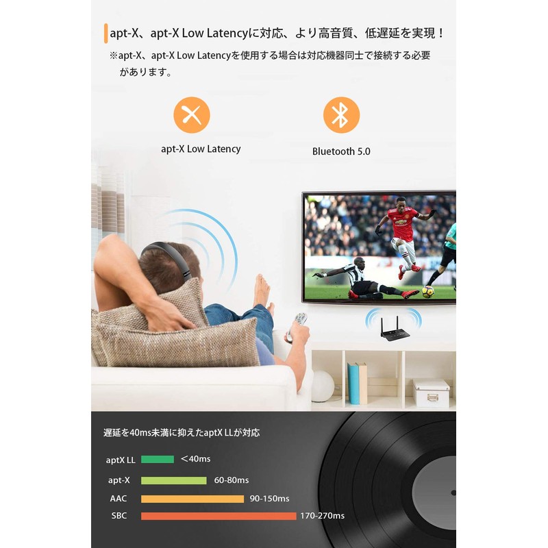 • Bluetooth 5.0 & aptx LL compatible: The compatible standard is Bluetooth 5.0, and the communication range is approximately 4 times larger than version 4.2, and the transfer speed is twice as fast as version 4.2. High quality audio codec aptX low latency for high sound quality and low latency Compared to traditional SBC codec, you can enjoy the comfortable experience without having to feel the difference between sound and video when watching TV or playing games. When using aptX, the Bluetooth connection device must be aptX compatible