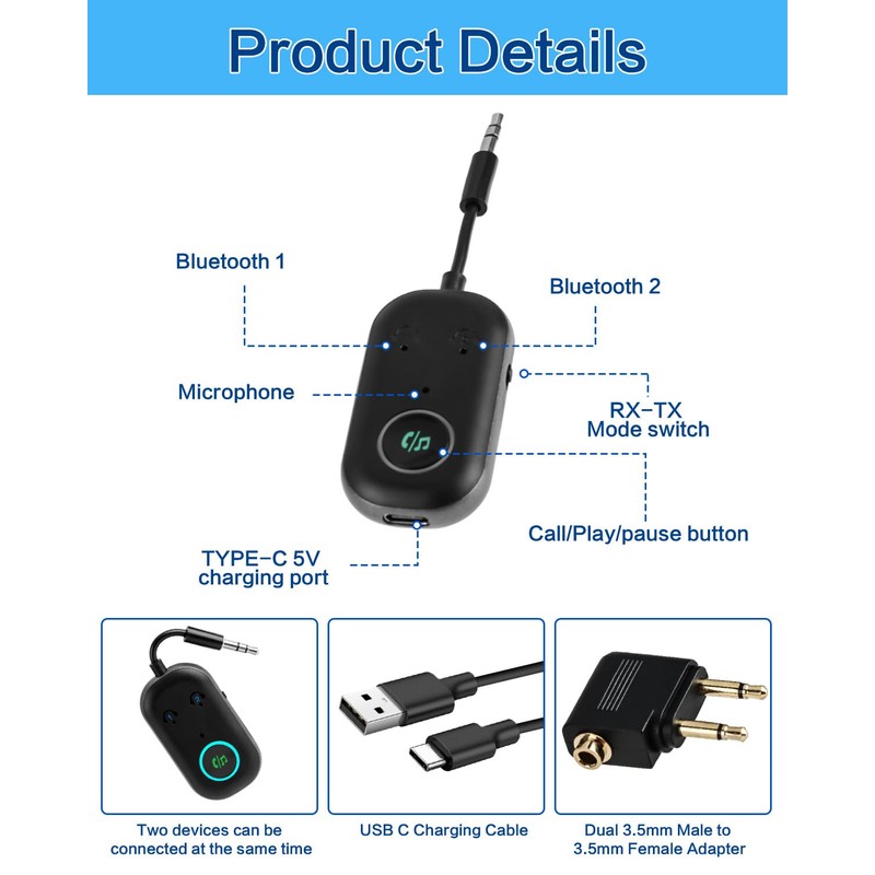 Upgrade your audio experience with this versatile 2-in-1 airplane bluetooth adapter and Receiver, designed to bring seamless wireless connectivity to your favorite devices. Featuring the latest Bluetooth 5.3 technology, this adapter delivers faster transmission speeds, lower latency, and a more stable connection, ensuring crystal-clear audio quality whether you're streaming music, watching movies, or making calls.