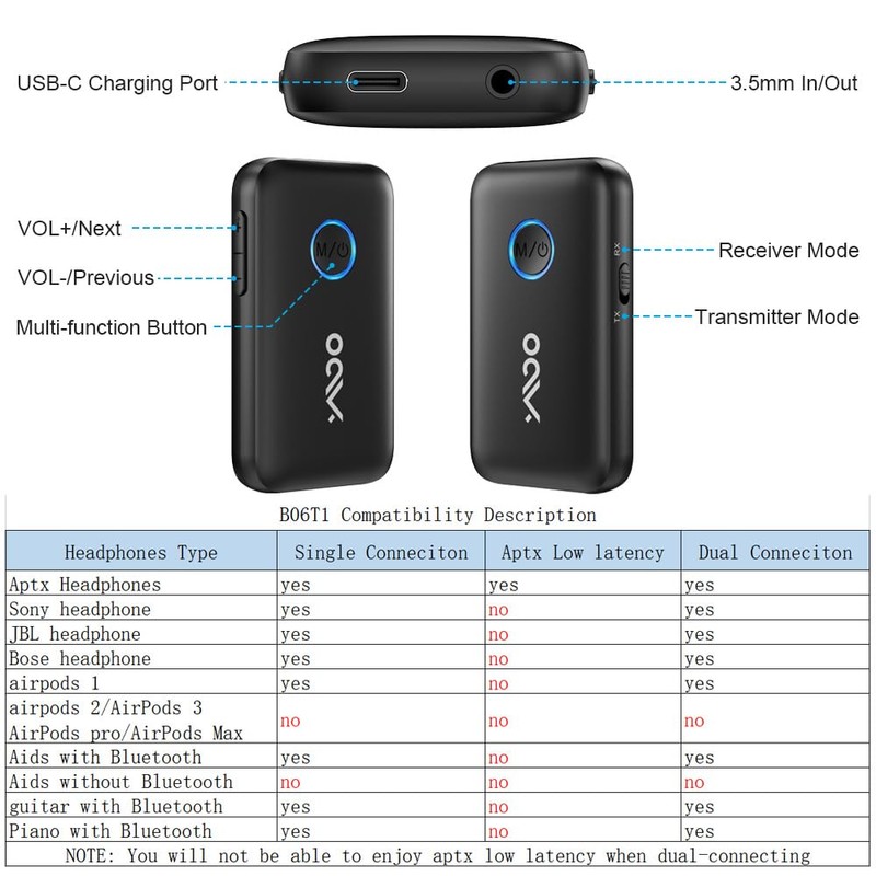 - Please note that B06T1 is not suitable for airpods pro/airpods gen/airpods max, some Sony bluetooth headsets, and music instruments such as guitar