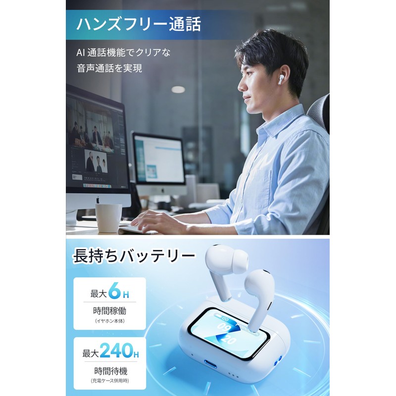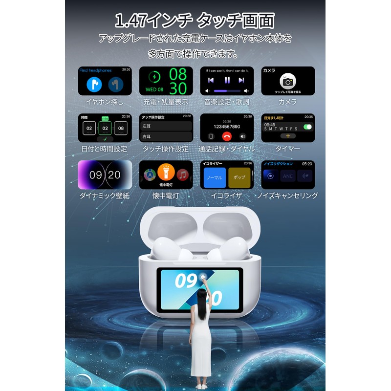 - (Revolutionary 1.47 inch touch screen charging case for unified operation) The industry's first multi-function touch screen charging case. Intuitively check the remaining battery level, date and time on the screen. You can also use the dedicated screen to adjust the volume, forward, backward, and pause music with one touch. The ear detection function allows you to automatically control the playback and stop by simply putting it on or off. It saves you the hassle of running and working. In addition, the "Find Earbuds" feature allows the earphones to sound at maximum volume with a single tap of the screen so you can find them quickly. Complete a variety of functions such as voice assistant activation, touch control setting, calling, switching game mode, step counting, etc with this small case
